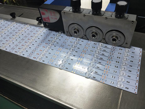 根据连板尺寸调节定位导轨,将要进行分切的V-CUT联板的对准放板导轨,然后手推入刀口,滚刀自动带走V-CUT连板带走并分切,从而将多联板V-CUT线路板分离。
