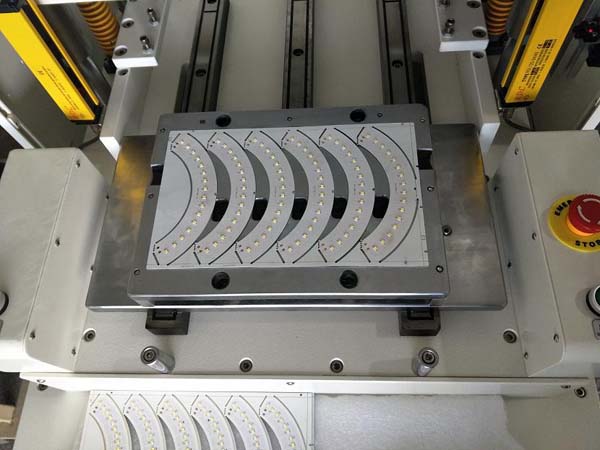 工作中下模采用自动推拉,减轻劳动强度,更提高安全度,同时取放成品十分方便。应用于电子行业如手机板,内存卡,手机软线路等分割。对于大批量通槽式PCB基板和软性线路板(FPC)的分割,效率尤为显著。配备安全感应装备。配模具使用,换模具简单方便。