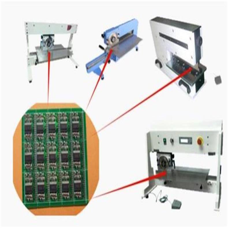 将要进行分切的V-CUT连板的V形槽对准下切刀的刀刃口,然后手推手柄,圆形刀片左右移动,从而将V-CUT连板分离。