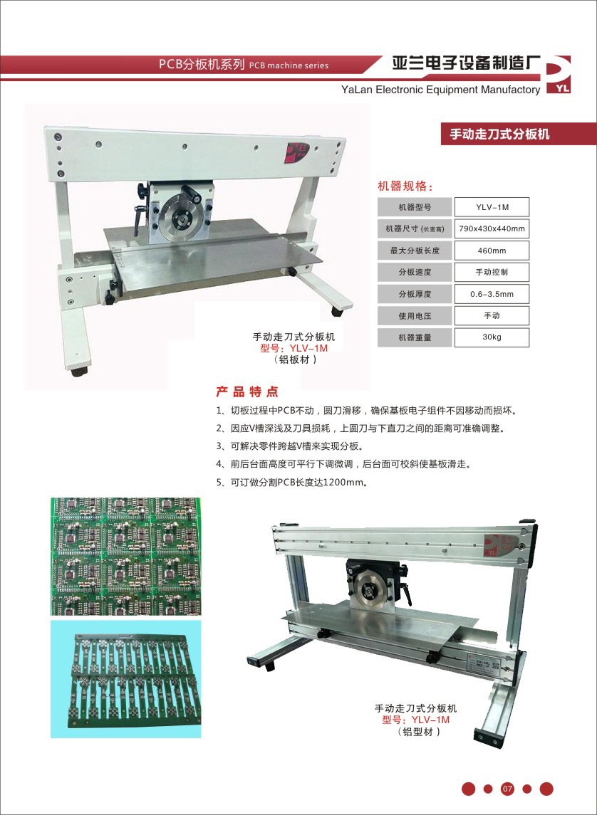 联系电话: 0769-81768376 13528582360 具体产品型号如下:YLVC-1 多刀分板机、YLVC-1 灯条分板机、YLVC-1S LED分板机、YLVC-2铡刀分板机、YLVC-2S铝基板分板机、YLVC-3 灯条分板机、YLVC-4 线路板分板机、YLV-2A 走刀式分板机、YLV-1M 手动分板机、YLVC-1M 电路板分板机、YLC 单点分板机、YLC-2 多点分板机、YLHP-1A 恒温热压机、YLHP-1S 恒温焊接机、YLCC零件计数器、YLSM锡膏搅拌机、YLPL 冲床分板机、YLPM冲压分板机、YLPE液压冲床分板机、YLPP-1A 脉冲热压机、YLPC-1A 脉冲式热压机、YLP-1S 简易热压机等非标自动化设备。大陆早期SMT