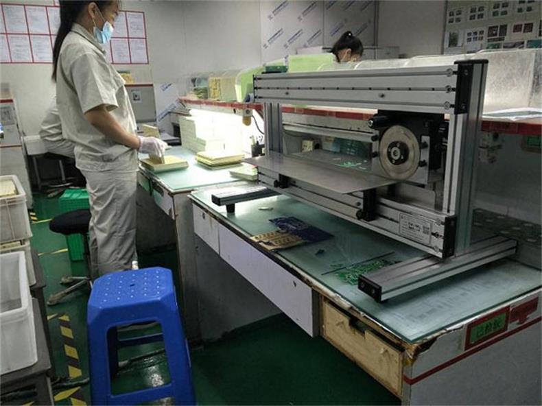 将要进行分切的V-CUT连板的V形槽对准下切刀的刀刃口,然后手推手柄,圆形刀片左右移动,从而将V-CUT连板分离。
